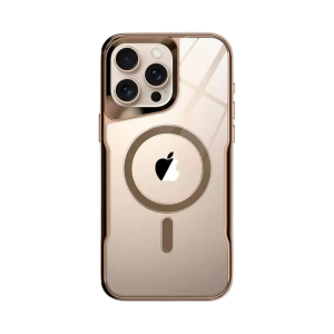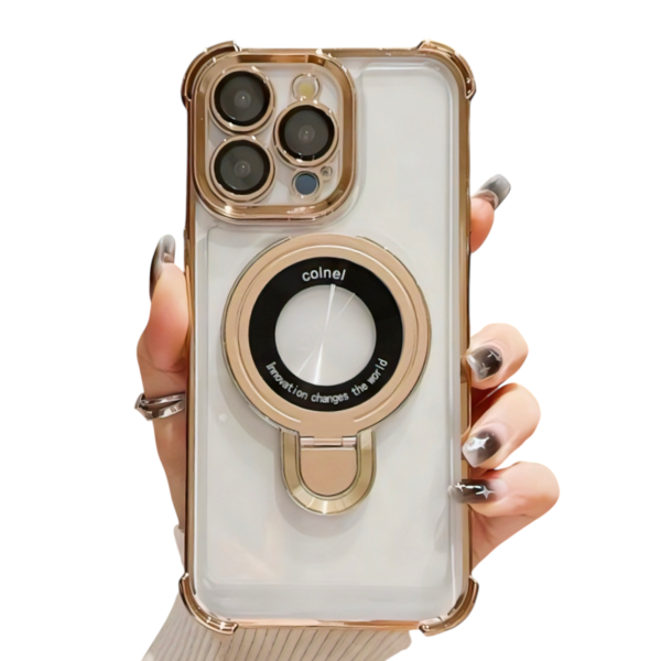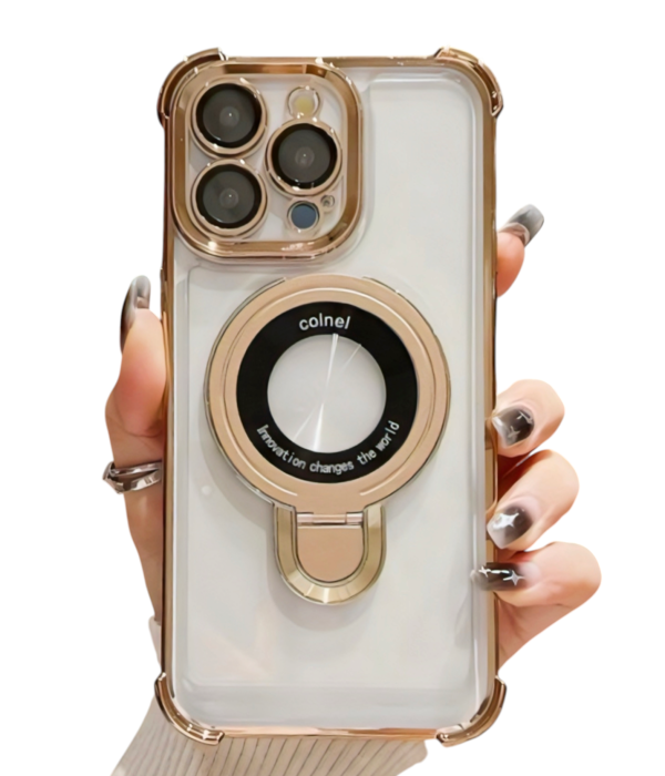 Premium Colnel Magnetic MagSafe Transparent iPhone Case with built-in metal stand, HD camera protector and anti yellow technology. Features strong 4 corner drop protection and available in Golden, Silver and Black.