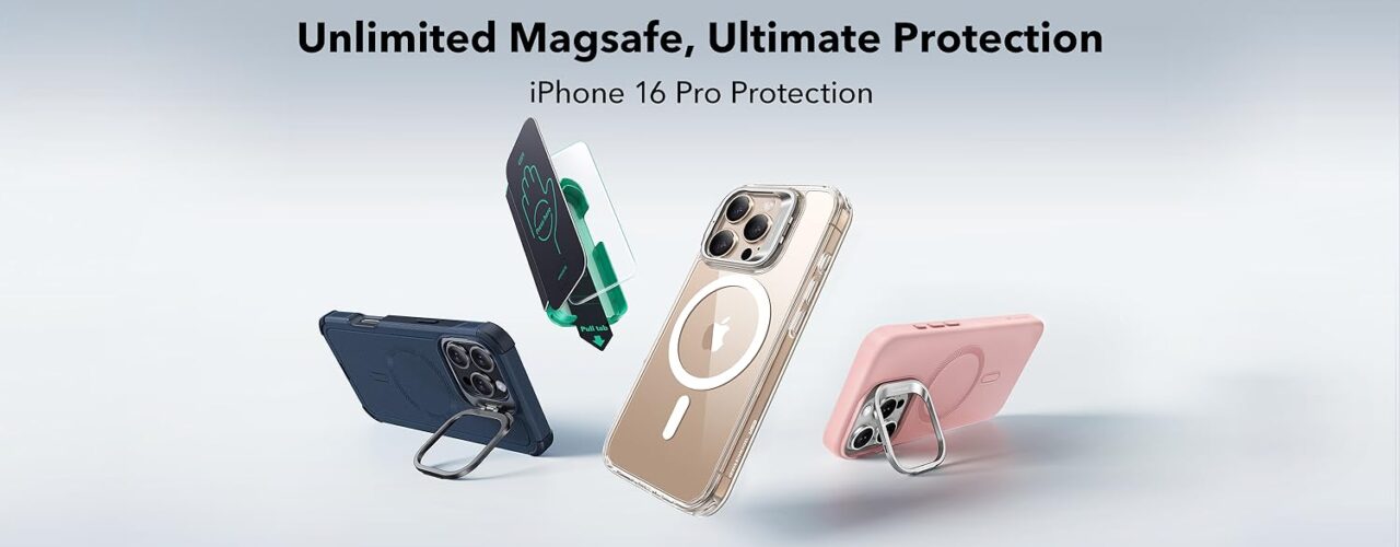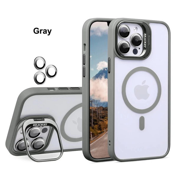 Premium crystal clear anti yellow transparent case with magnetic MagSafe support, metal camera window stand & free camera ring protector. Stylish grey soft border for shock protection. Compatible with iPhone 12–17 series.