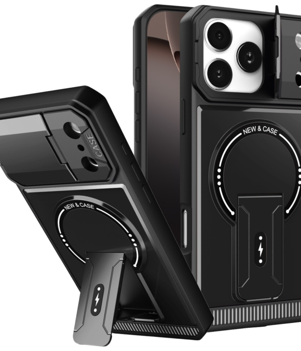 Premium Armour Feature iPhone Case with MagSafe support, stand, camera window stand, water resistance & heavy drop protection. Available in Black & Grey. Fits iPhone 12–17 series.